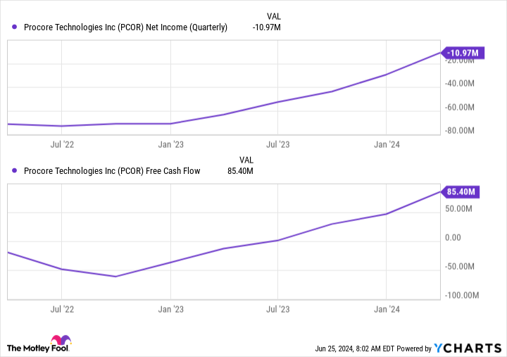 Embora a Procore só tenha se tornado uma empresa pública em 2021, tem apresentado consistentemente um forte desempenho que só melhora com o tempo. Sua receita tem crescido constantemente e atrai cada vez mais clientes, incluindo grandes clientes que gastam grandes quantias de dinheiro em sua plataforma todos os anos. A empresa ainda não é lucrativa porque ainda está em modo de crescimento. No entanto, estamos fazendo progressos constantes no sentido de nos tornarmos lucrativos. Considere a melhoria no prejuízo líquido e no fluxo de caixa livre nos últimos dois anos.