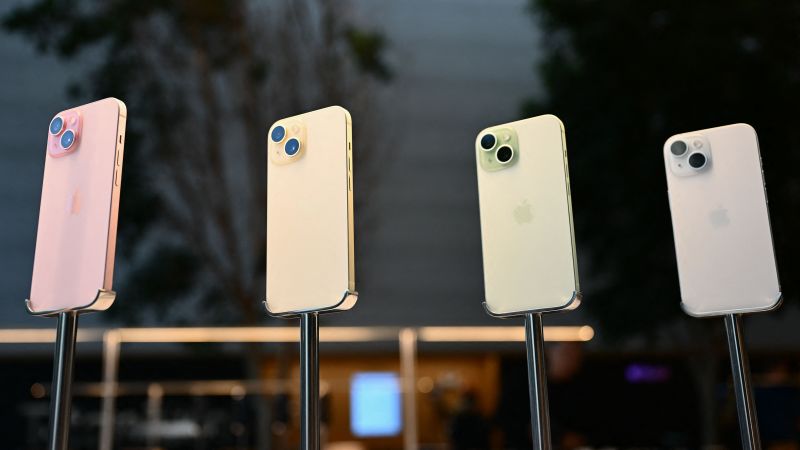 Série Apple iPhone 15 em exibição à venda na loja The Grove Apple em Los Angeles, Califórnia. Wall Street espera que o iPhone 16 venha com grandes atualizações de IA.