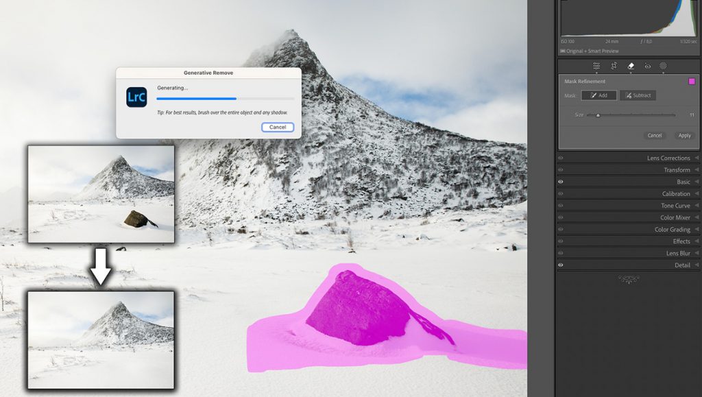 Muitos dos itens indesejados costumam ser de tamanho pequeno. Pode ser uma mancha de poeira no sensor ou um pequeno objeto que atraia atenção negativa. Esses pequenos itens geralmente não requerem conteúdo gerado por IA. Um simples pincel de clonagem lhe dará resultados bons o suficiente.