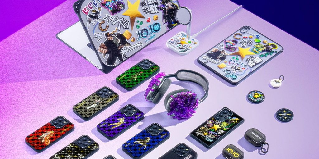 CASETiFY destaca uma capa Hermit Purple Thorns AirPods Max inspirada no protagonista Joseph Joestar e um pingente de telefone com corrente dourada com tema Jojo que “permite que os fãs usem símbolos do anime popular diariamente, eu acho”. Outros produtos incluem capas de suporte de anel Impact, Mirror, Bounce, Ultra Bounce, Clear, Impact da CASETiFY, capas de personagens Jotaro e Dio, AirPods, Galaxy Buds, MacBooks, iPads, bancos de energia e outras guloseimas.