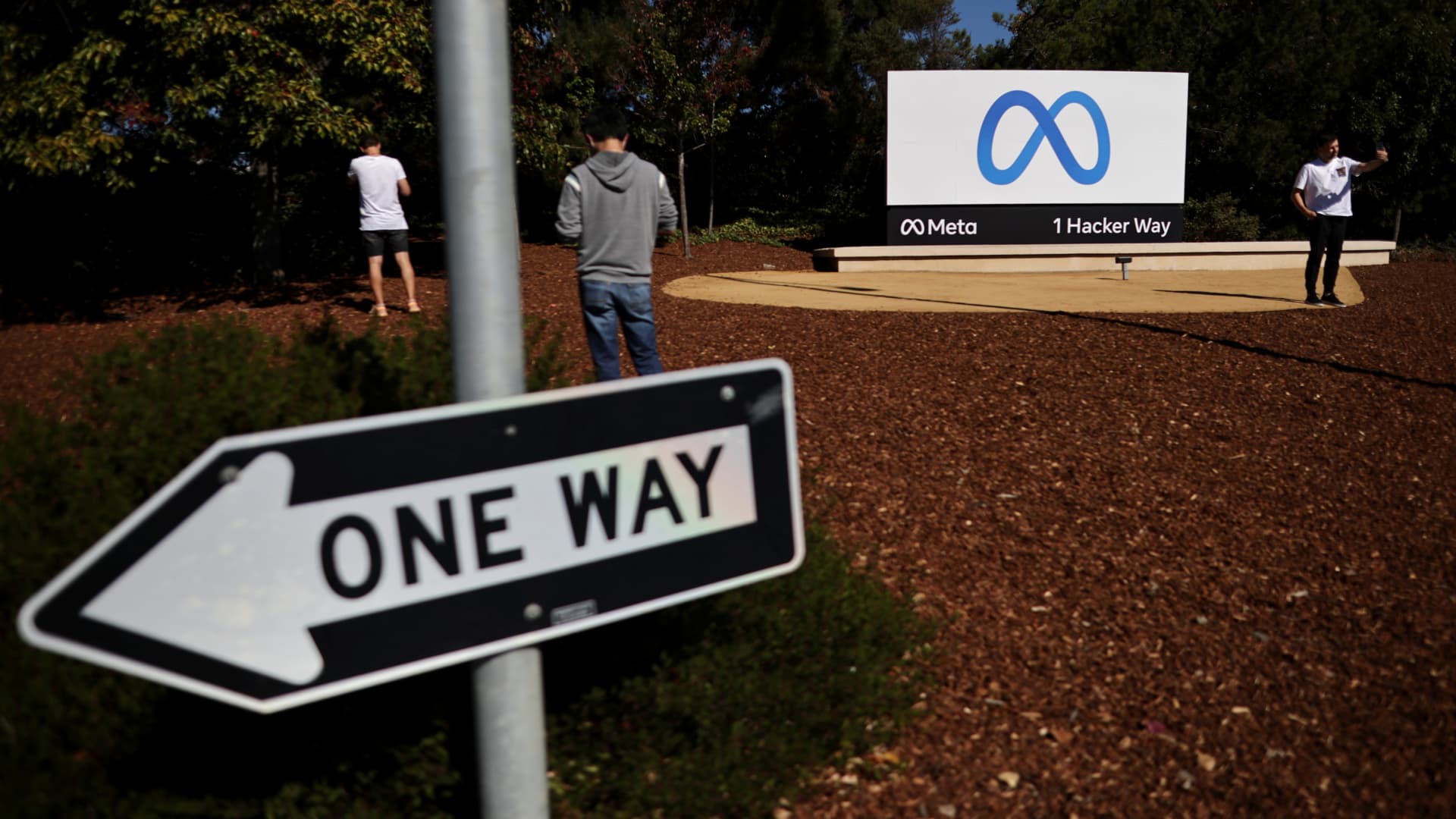 Um homem tira uma selfie em frente à placa Meta, novo nome da empresa anteriormente conhecida como Facebook, em sua sede em Menlo Park, Califórnia, em 28 de outubro de 2021.
