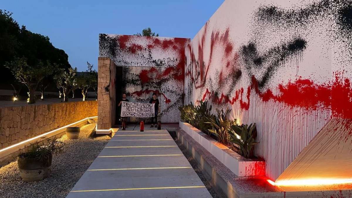 Um vídeo divulgado pelo movimento Futuro Vegetariano mostra dois ativistas derrubando a fachada branca de uma casa na costa oeste de Ibiza e segurando uma faixa que diz “Ajude o planeta, alimente os ricos, abolindo a polícia”.