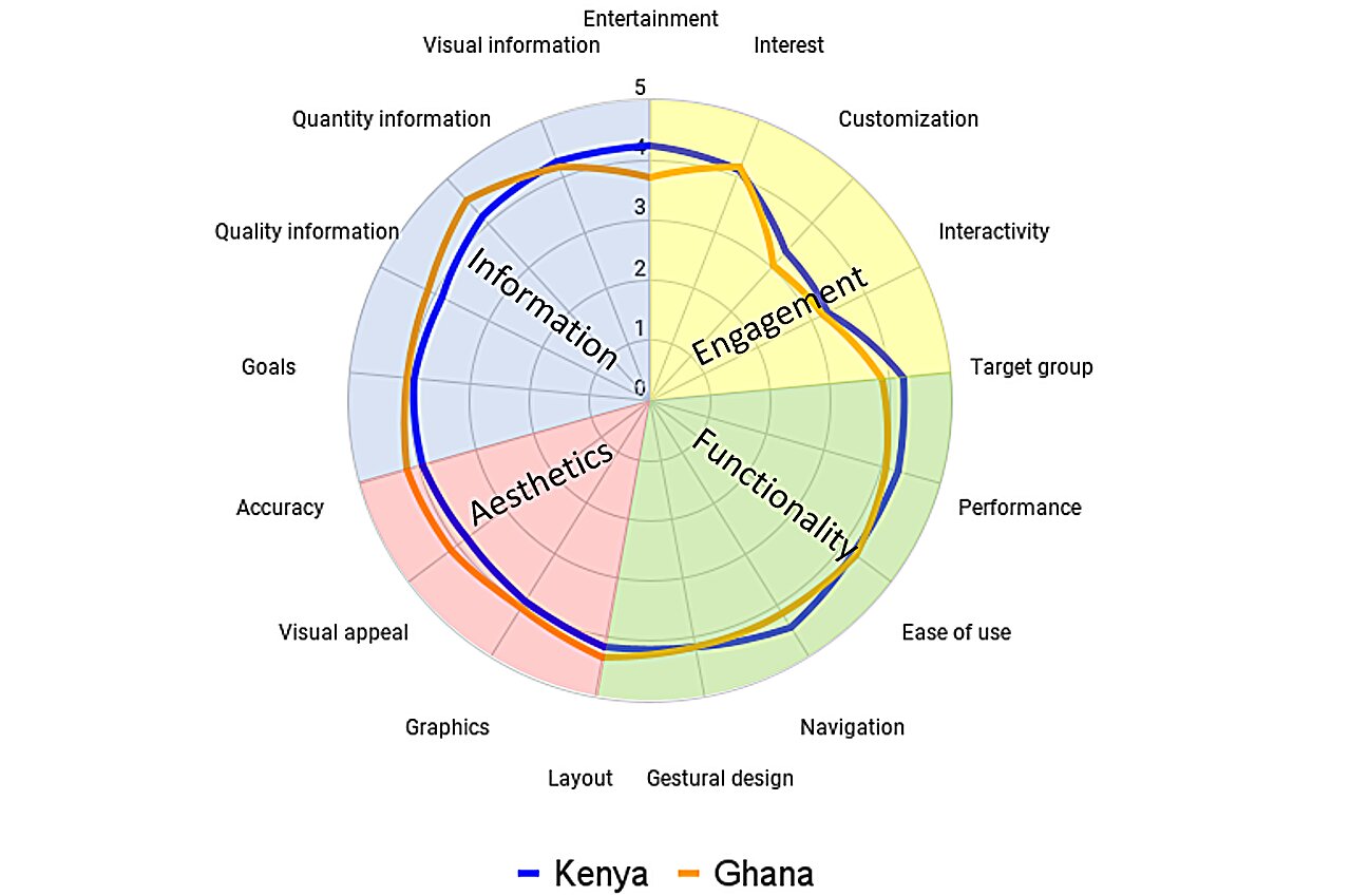 Classificação do gráfico de radar das áreas objetivas de qualidade para cada aplicativo de acordo com a versão do usuário da Escala de Classificação de Aplicativos Móveis (uMARS). Os resultados são discriminados por país. crédito: Jornal de pesquisa médica na Internet (2024). DOI: 10.2196/51628