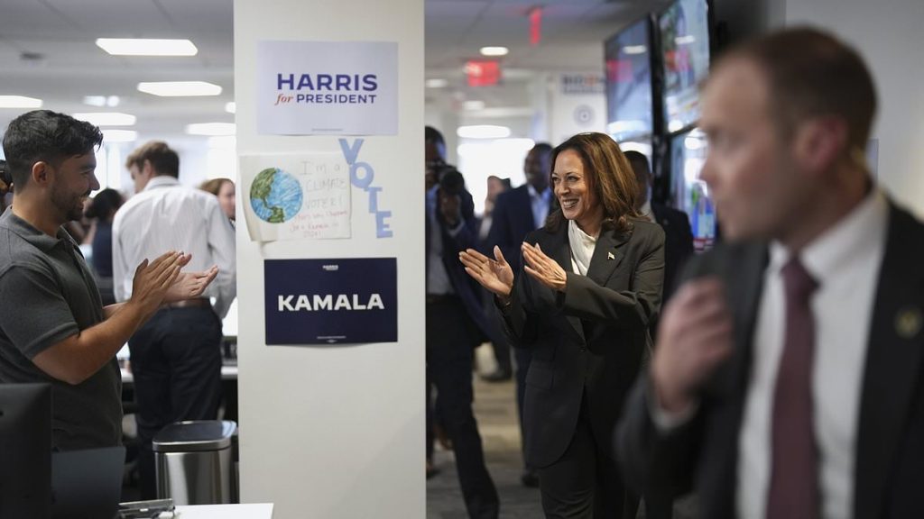 Já havia sinais de que a campanha estava em andamento, com cartazes dizendo: “Harris para Presidente”, “Kamala” e “Lei de Restauração” foram afixados nas paredes do escritório.