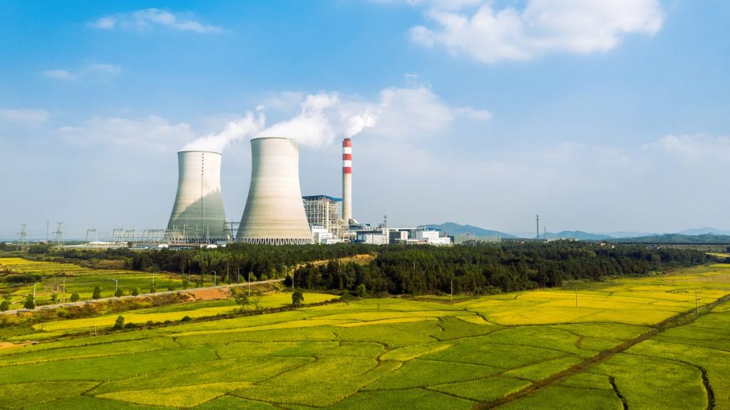 Sob um céu azul, uma usina nuclear à distância e um campo verde em primeiro plano