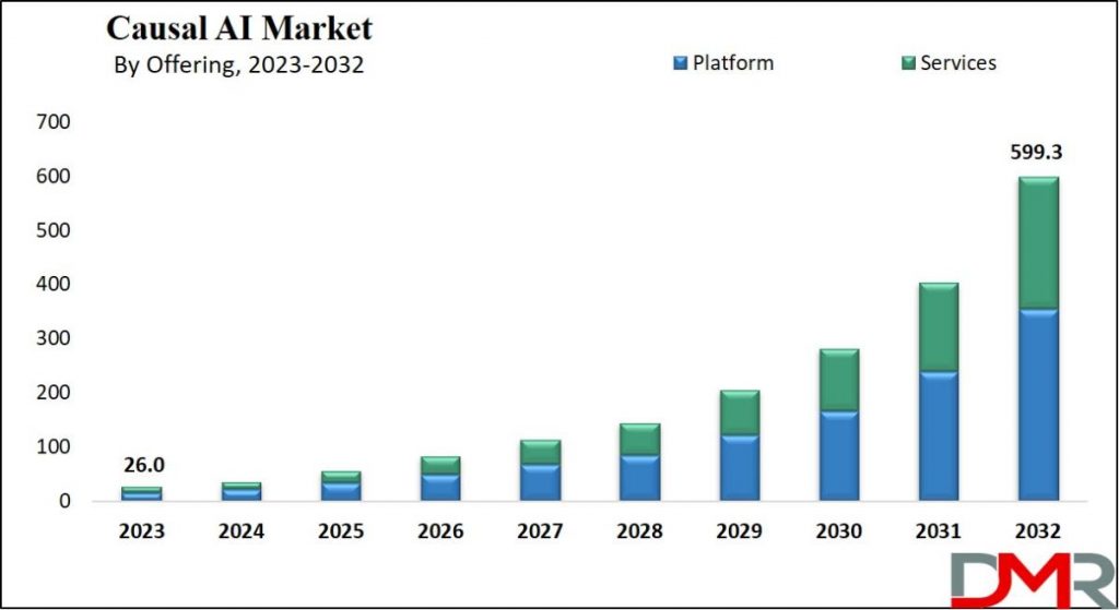 The Global Causal AI Market size was valued USD 26.0 million in 2023 and is further anticipated to reach USD 599.3 million by 2032 according to Dimension Market Research. The market is anticipated to register a CAGR of 41.7% from 2023 to 2032.
