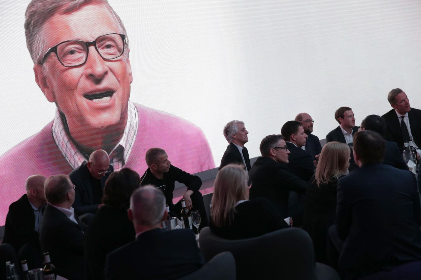 O fundador da Microsoft, Bill Gates, aparece na tela durante a cerimônia do Prêmio Axel Springer em Berlim. … [+]