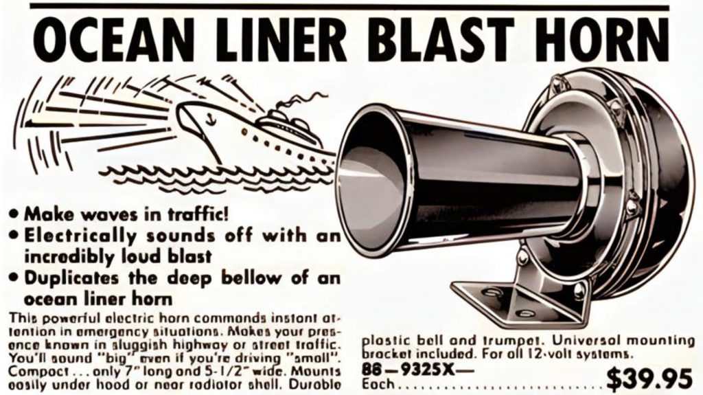 Canto, canto, canto. Você pode comprar qualquer número de buzinas do catálogo JC Whitney com uma variedade de sons, incluindo uma buzina que “guincha como um Mustang de verdade” (provavelmente não para proprietários de Chevrolet Camaro), uma buzina eletrônica de burro que faz um “hee-haw” som e muito mais. ”E apresentou o Ocean Liner Blast Horn, uma atualização ideal para os iates terrestres que dominavam as estradas nas décadas de 1960 e 1970.
