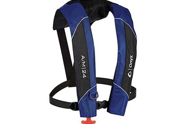 Por favor, pegue Colete salva-vidas inflável automático/manual Onyx A/M-24 (PFD) Vamos pescar com segurança e conforto na água com você nesta temporada. Ele infla automaticamente quando submerso em água ou quando o usuário puxa a alça de “empurrão para inflar”.