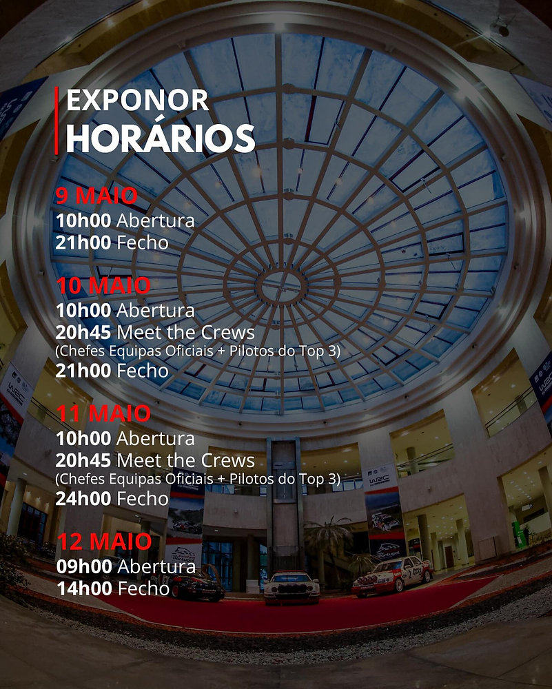 Quanto a Exponor, em Leça da Palmeira, estará aberto das 10h00 às 21h00 nos dias 9 e 10 de maio. No dia 11 de maio, o horário de funcionamento será alargado para as 24h00, enquanto no último dia do evento, domingo, encerrará às 14h00. A Exponor acolherá o centro de operações e parque de assistência às equipas participantes.