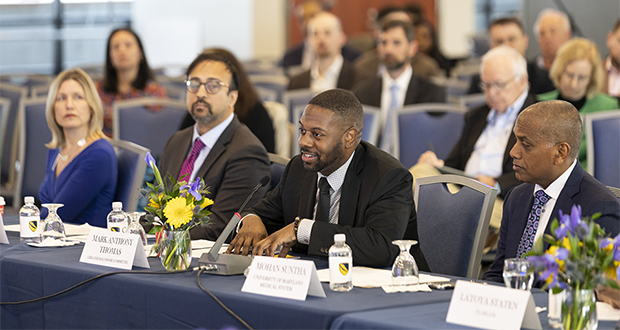 A partir da esquerda: Jennifer Bey, Vice-Presidente Executiva de Política e Pesquisa da Comissão da Grande Baltimore; Pothik Chatterjee, vice-presidente executivo de política e diretor econômico do GBC; Mark Anthony Thomas, presidente e CEO do GBC Mohan Sunta, presidente do GBC e presidente e CEO do Sistema Médico da Universidade de Maryland, responde a perguntas durante uma mesa redonda organizada pelo GBC. (Foto cortesia de Haldan Kirsch, Comissão da Grande Baltimore)