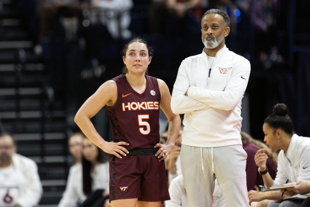 CHARLOTTESVILLE, VA - 3 DE MARÇO: Georgia Amoore #5 e Head of the Virginia Tech Hokies assistem a um lance livre durante o primeiro tempo contra o Virginia Cavaliers na John Paul Jones Arena em Charlottesville, VA. Treinador Kenny Brooks em 3 de março de 2024.  (Foto de Ryan M. Kelly/Getty Images)