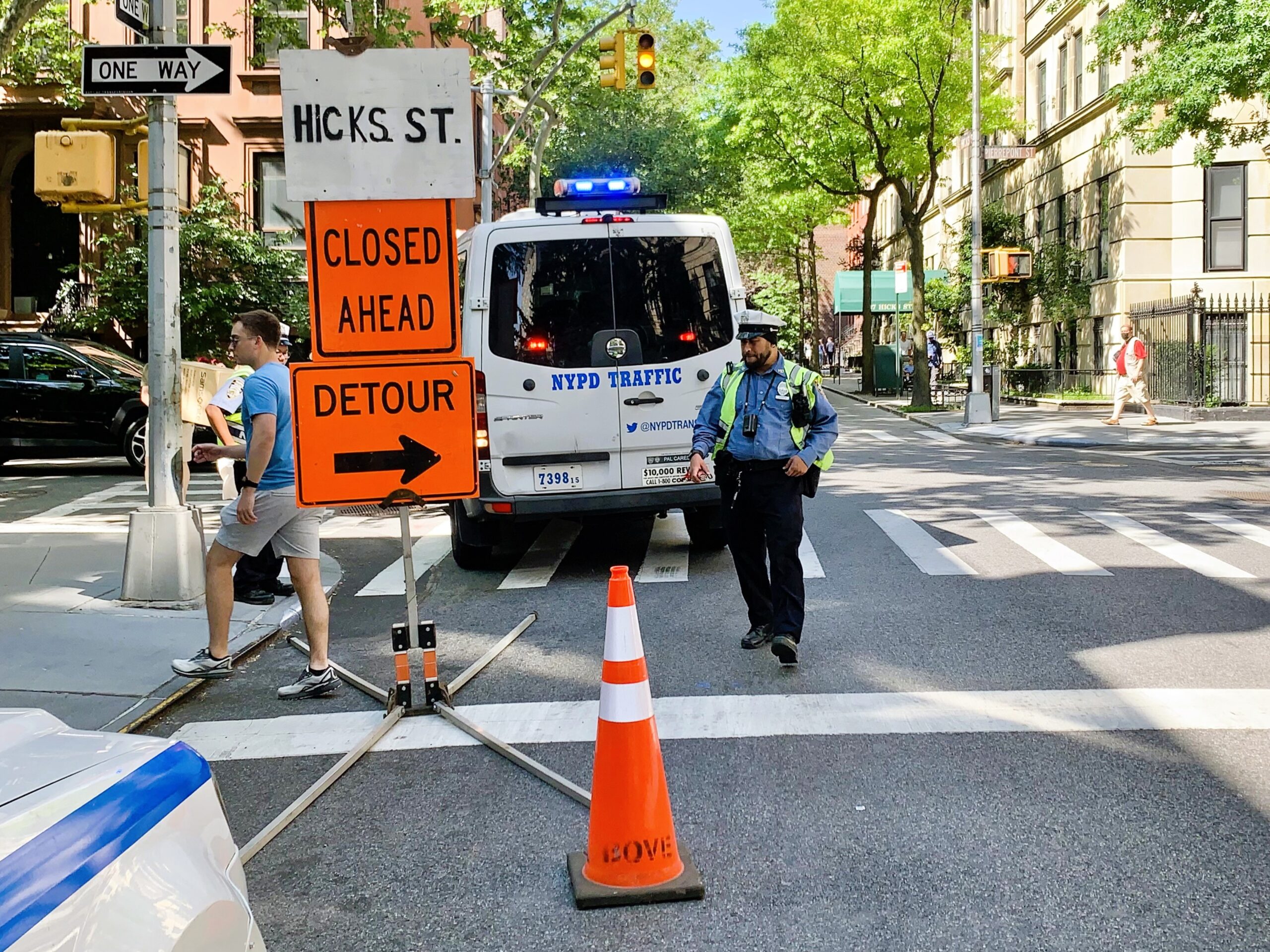 Os agentes de trânsito do DOT desviaram veículos da Hicks Street para a Pierrepont Street durante o fechamento do BQE com destino ao Queens na tarde de sábado, 1º de junho. Foto de : Mary Frost, Brooklyn Eagle