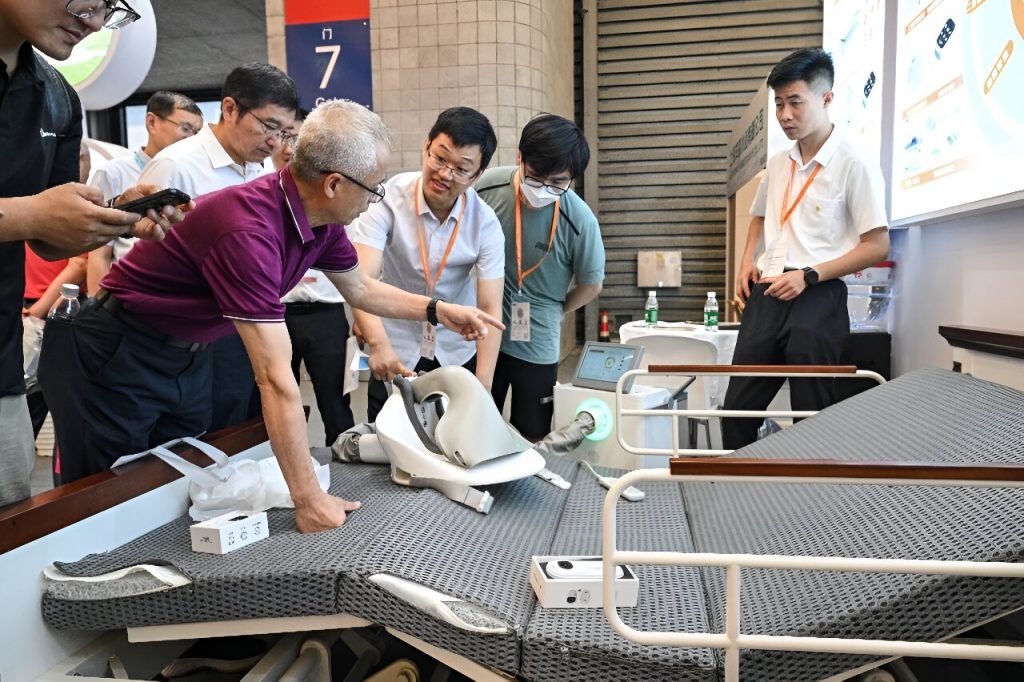 Um monitor de sono conectado à Internet, um braço robótico e uma placa de lanchonete para contagem de calorias foram exibidos na Feira Comercial da Indústria de Cuidados ao Idoso de Xangai.