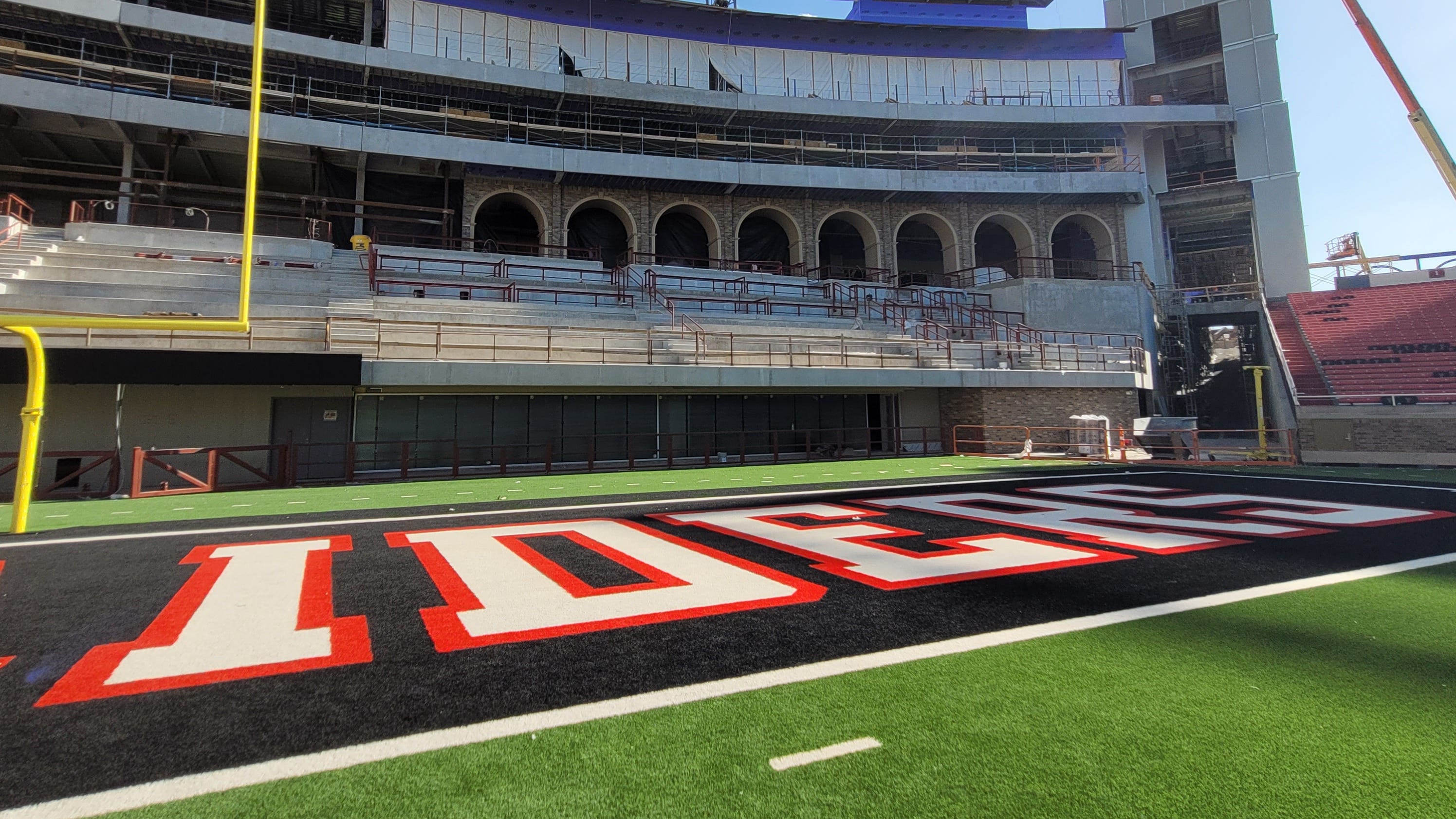 Uma joia do futebol americano da Texas Tech, o projeto de US$ 242 milhões apresenta um clube em nível de campo, caixas de madeira, colunatas, escritórios de treinadores, suítes luxuosas e um deck para festas.