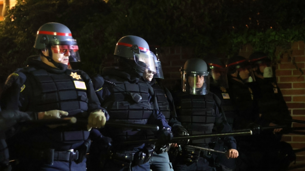 2 de maio de 2024: Polícia durante um protesto pró-Palestina na UCLA em Westwood, Califórnia. Josias True/Shutterstock