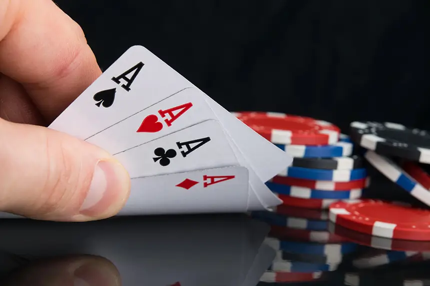 - Quatro do mesmo tipo – A terceira mão de pôquer de maior valor é a Four-of-a-kind, que consiste em quatro cartas do mesmo valor, por exemplo, quatro Ases. Além das quatro cartas, o jogador pode utilizar a quinta carta para completar a sequência, independente do naipe e do valor. Esta carta é chamada de “Kicker”. Em caso de empate, os jogadores devem desempatar vendo qual conjunto de cartas tem o maior valor;