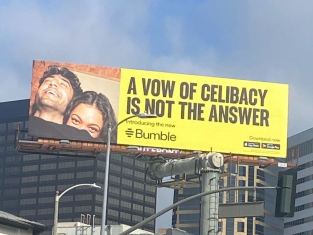 No Twitter/X, a foto de um outdoor do Bumble se tornou viral pelos motivos errados. “Não desista de namorar, você deveria virar freira”, estava escrito ao lado da foto de uma mulher andando pela rua ao pôr do sol. “Um voto de celibato não é a resposta”, acrescentou outro, ao lado da foto de uma mulher sorridente. “Bumble é um pedaço de merda e precisa parar de envergonhar as mulheres para que voltem ao aplicativo”, tuitou uma pessoa. Eles deveriam “direcionar os homens com anúncios dizendo-lhes para serem normais”.