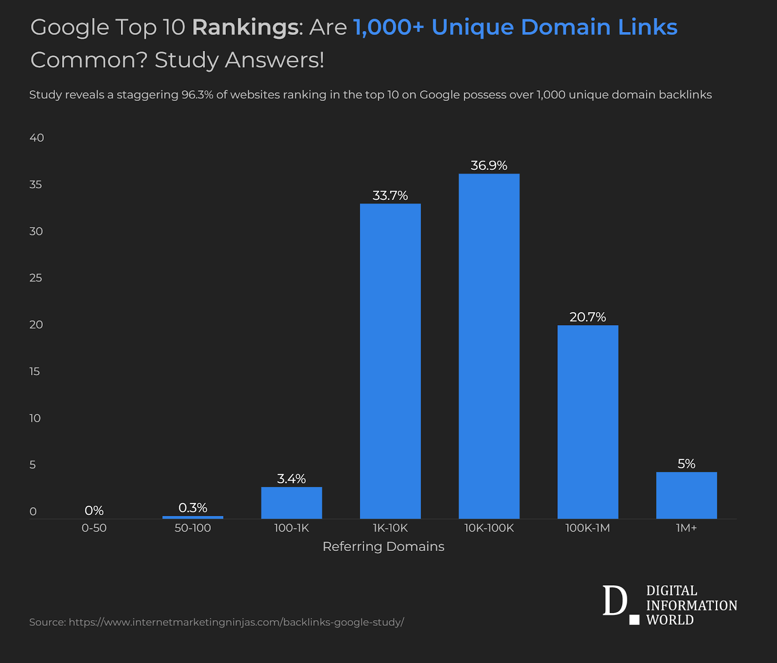 Uma nova análise do Internet Market Ninja revela que é impossível para um site se classificar entre os 10 primeiros resultados de pesquisa do Google, a menos que tenha muitos links. Nossa análise revelou que todos os 10 sites mais bem classificados no Google têm mais de 1.000 backlinks. Apenas 0,3 dos 10 principais resultados tiveram menos de 100 backlinks.