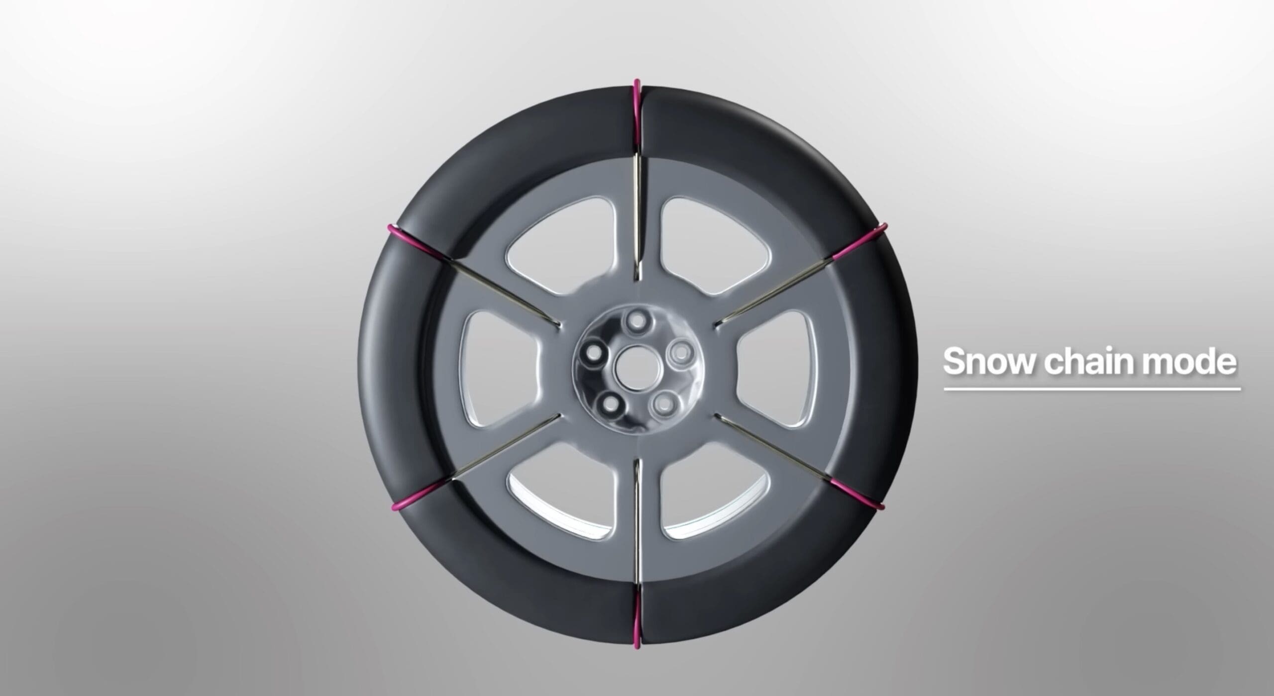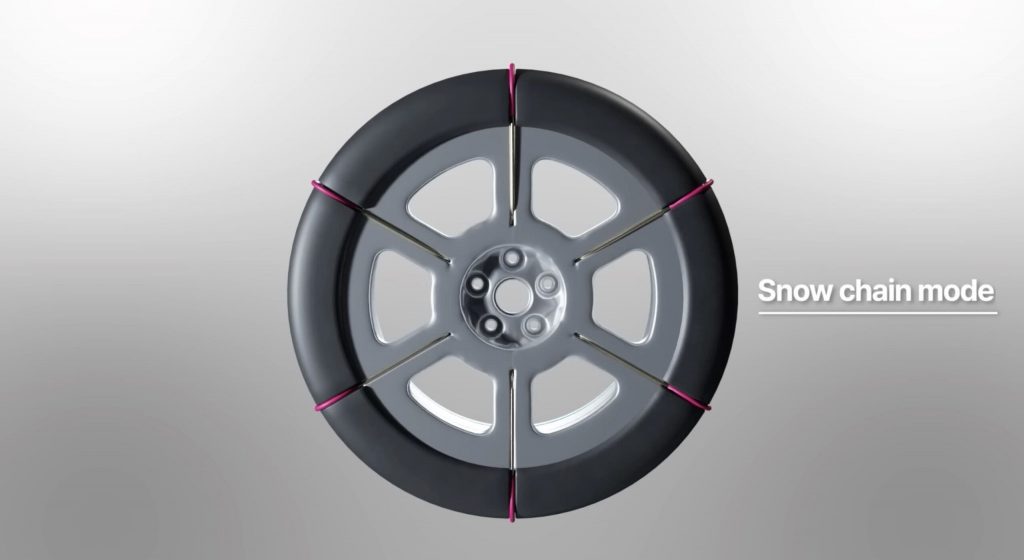Essas ligas com memória de forma são colocadas em ranhuras radiais ao longo dos pneus e rodas e são comprimidas em formato de “L” quando não estão em uso. Ao apertar um botão, a corrente elétrica forma o pneu em forma de “J”, empurrando a “corrente” para fora do pneu e melhorando a aderência.