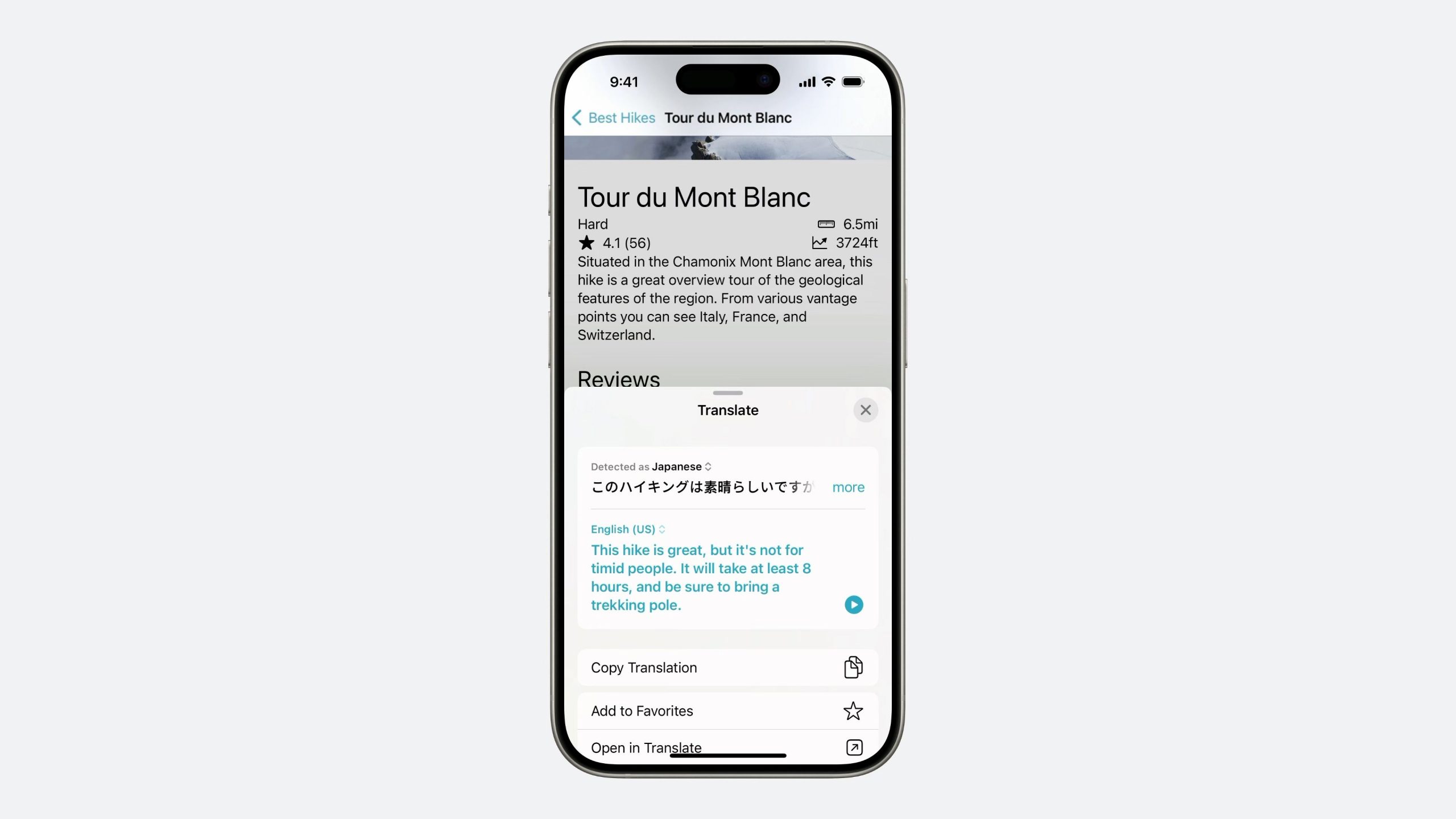 Embora o iPhone, o iPad e o Mac já ofereçam tradução no nível do sistema para itens como textos destacados e sites exibidos no Safari, esta API fornece uma solução conveniente para conteúdo gerado pelo usuário, como ofertas. Por exemplo, se um usuário escrever uma resenha em japonês, o texto poderá ser imediatamente traduzido para outros idiomas.