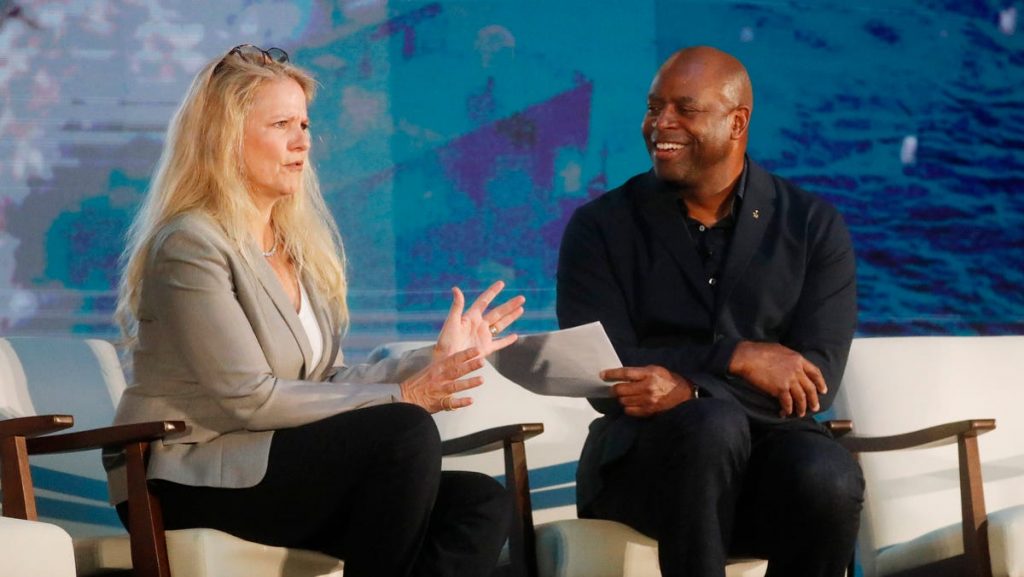 A presidente e diretora de operações da SpaceX, Gwynne Shotwell, e o ex-astronauta da NASA Leland Melvin participam do painel de discussão do Edison Awards 2024. O evento foi realizado na quinta-feira, 18 de abril de 2024, no Calusa Sound Convention Center em Fort Myers. Fundada em 1987,