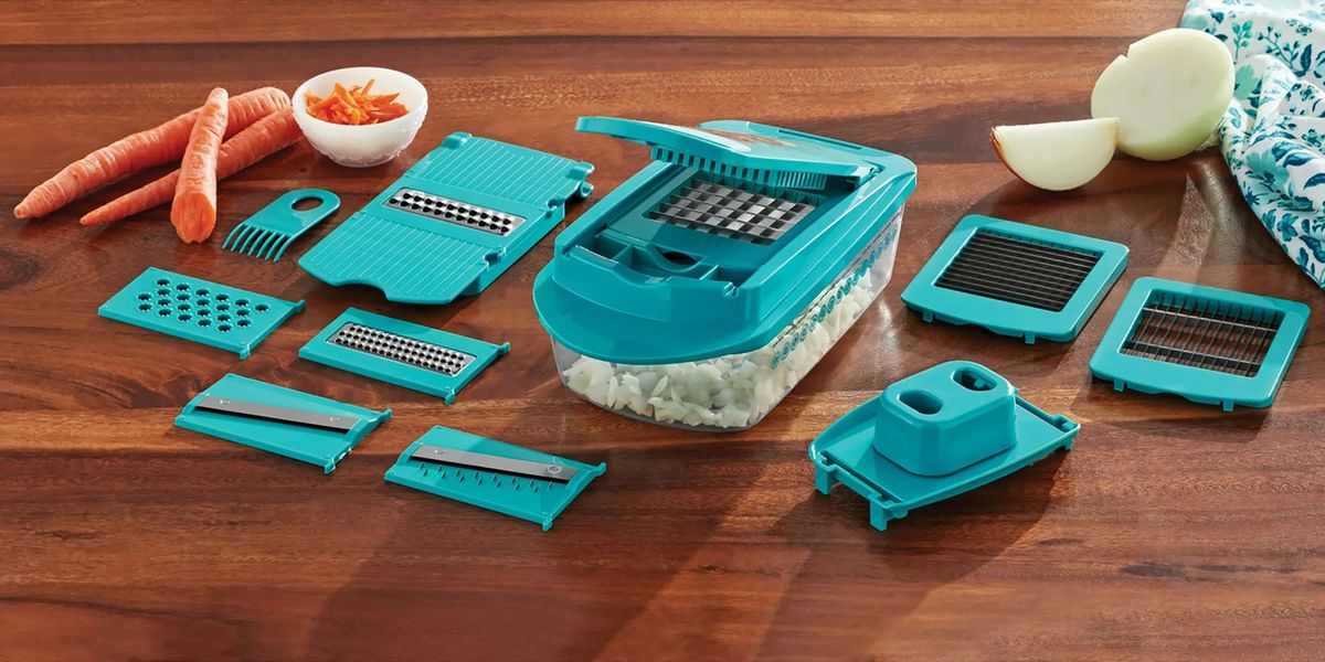 Você pode estar se perguntando quais são essas oito tarefas. O conjunto inclui três lâminas de corte de tamanhos diferentes e cinco lâminas adicionais para fatiar, juliana, ralar e juliana, todas feitas de aço inoxidável durável. Isso basicamente elimina a necessidade de conjuntos de facas, mandolinas e raladores de queijo separados, tudo em uma única ferramenta.