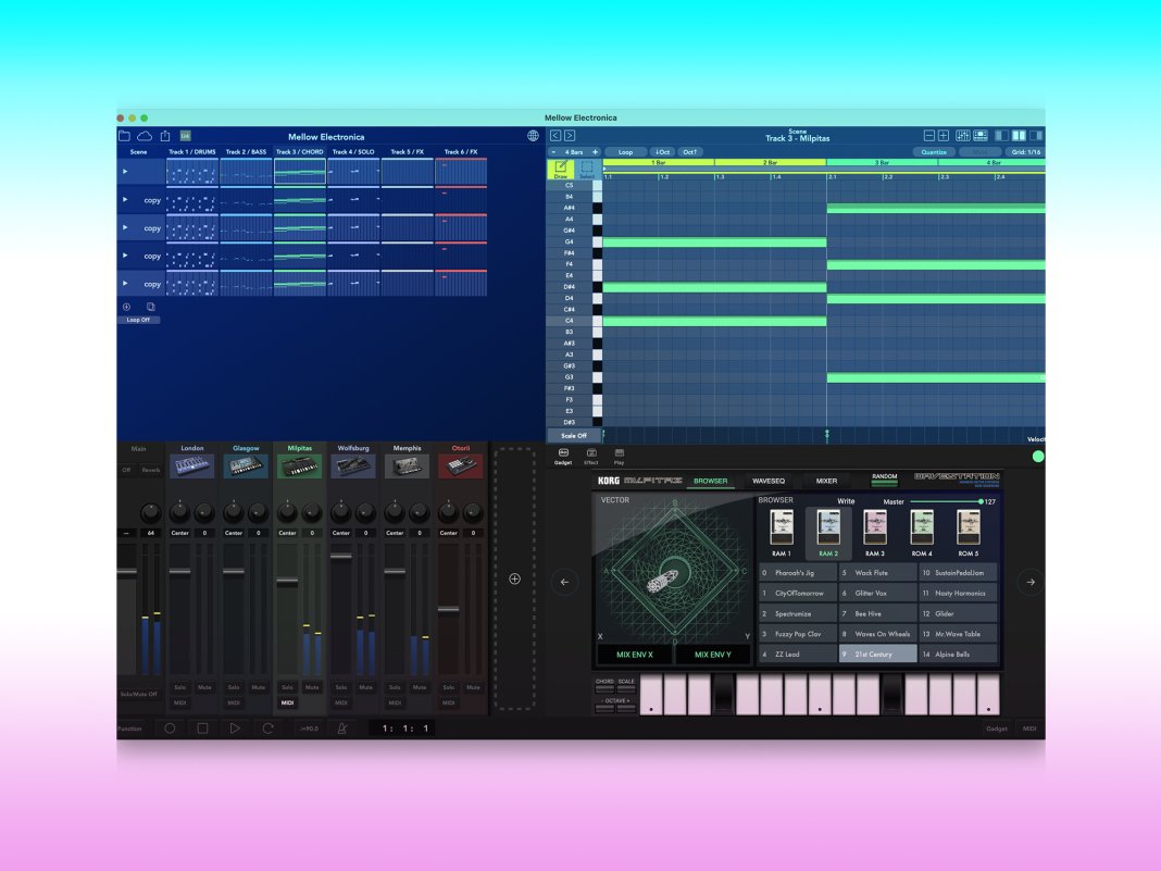 Este aplicativo é independente, mas pode ser exportado em vários formatos. GadgetCloud, serviço de compartilhamento de projetos da Korg. Exporte toda a mixagem ou faixas individuais/todas como stems e, em seguida, exporte arquivos MIDI ou projetos do Ableton Live em formato de áudio, MIDI ou plug-in, dependendo de como você deseja proceder. Há também uma opção iCloud Drive que permite fazer upload e download de projetos para trabalhar em seu Mac ou dispositivo iOS.