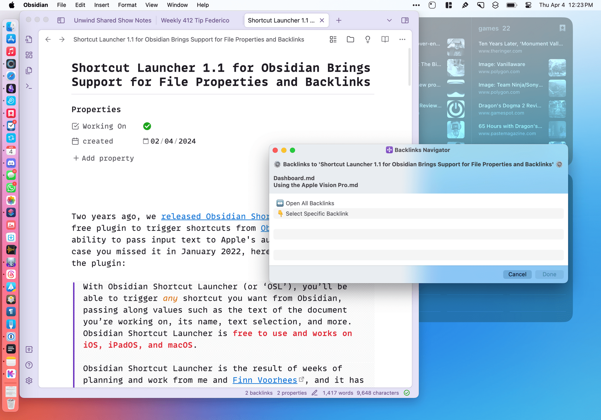 No final desta semana, no MacStories Weekly para membros do clube, compartilharemos atalhos avançados que aproveitam os novos recursos do Obsidian Shortcut Launcher. Os atalhos permitem converter documentos Obsidian com propriedades específicas em tarefas no aplicativo Things que estão profundamente vinculadas ao Obsidian. Tenho usado esse atalho nas últimas semanas como parte de minha coleção de atalhos do Things. Gosto da forte integração com Obsidian.