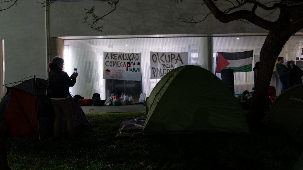Na quarta-feira, os estudantes reuniram-se na Faculdade de Belas Artes e decidiram continuar o protesto na Faculdade de Ciências, onde montaram tendas de campismo para abrigo durante a noite, rodeados de bandeiras palestinianas, velas e faixas com frases como: instalado. “Unidade Proletária por uma Palestina Livre”, “Israel não é uma democracia, Israel é um estado terrorista” e “A revolução começa aqui”.