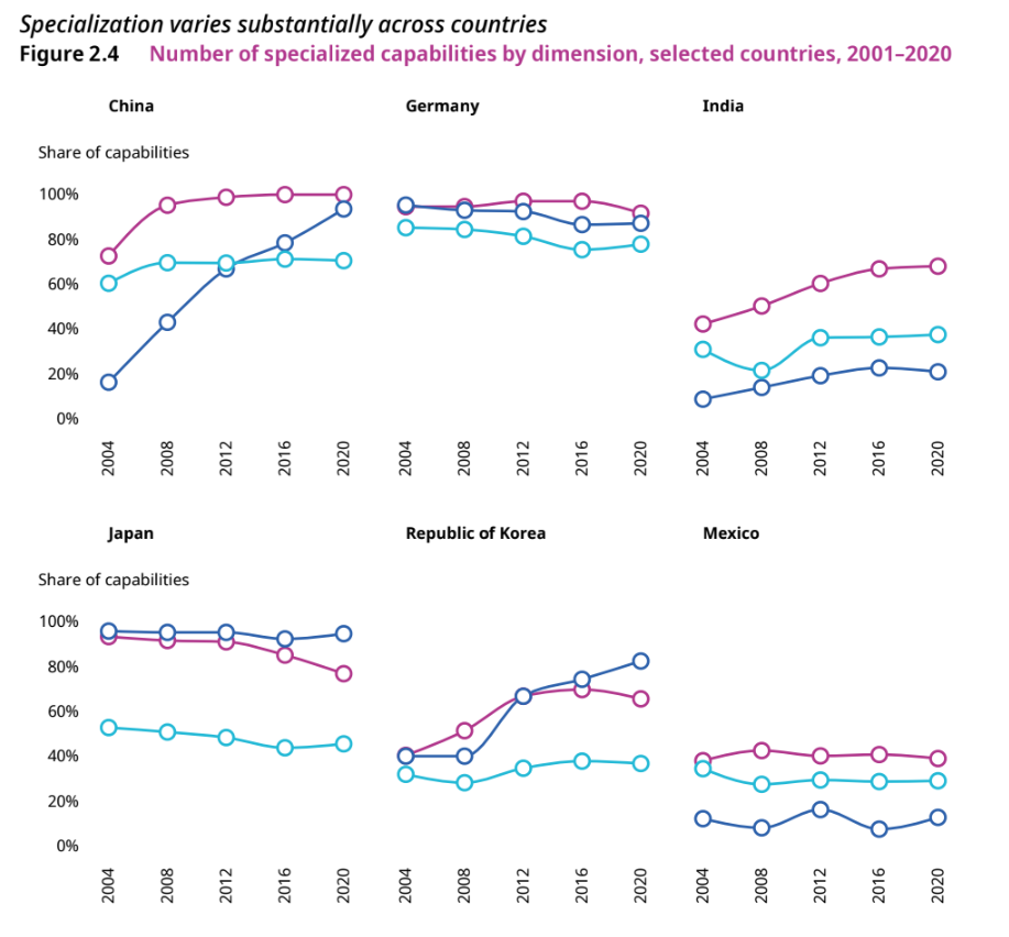 Globalmente, os países avaliados pelo relatório da OMPI aumentaram a sua capacidade científica, tecnológica e produtiva em 5% entre 2001-2004 e 2017-20. A China, em particular, melhorou significativamente as suas capacidades tecnológicas, graças, em grande parte, a um boom na actividade nacional de pedidos de patentes. De 2001 a 2004, a China especializou-se em 16% da sua capacidade tecnológica total, mas durante o período de estudo de 2017 a 2020, essa proporção aumentou para 94% da capacidade. Outro país que viu aumentos significativos na capacidade é a Coreia do Sul. Na Coreia do Sul, a capacidade científica e tecnológica aumentou de 40% para 66% e 83%, respetivamente. Na Índia, a especialização científica aumentou de 42% para 68% e a especialização técnica aumentou de 9% para 21%. Embora a Alemanha e o Japão tenham desfrutado de elevados níveis de especialização de capacidade durante o período inicial do estudo, ambos os países registaram cortes nos três sectores até 2020.