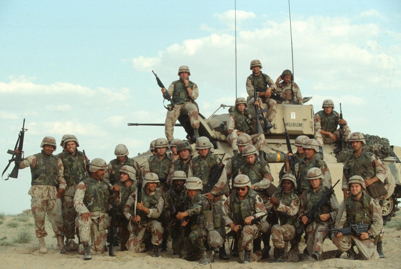 Retrato de grupo de soldados americanos posando em torno de um Veículo de Combate Bradley (comumente conhecido como Veículo de Combate Bradley) … [+] “Hellraiser” durante a Guerra do Golfo, Iraque, 1991. (Foto de Allan Tannenbaum/Getty Images)