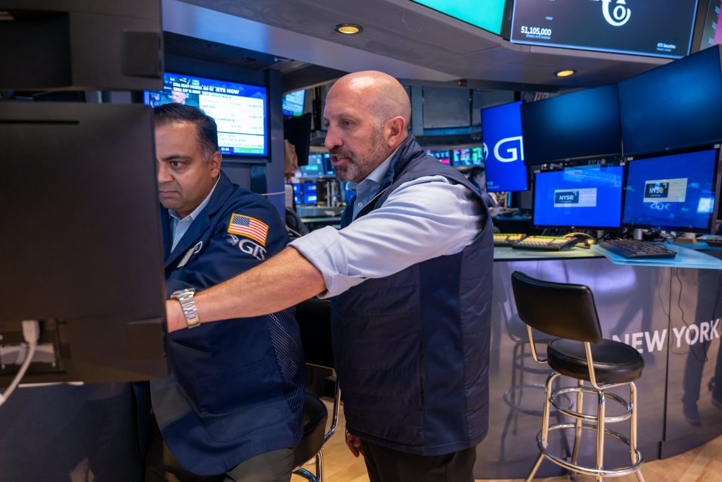 Os traders trabalham no pregão da Bolsa de Valores de Nova York (NYSE) enquanto uma foto da vice-presidente Kamala Harris aparece na tela de uma televisão em 22 de julho de 2024 na cidade de Nova York.