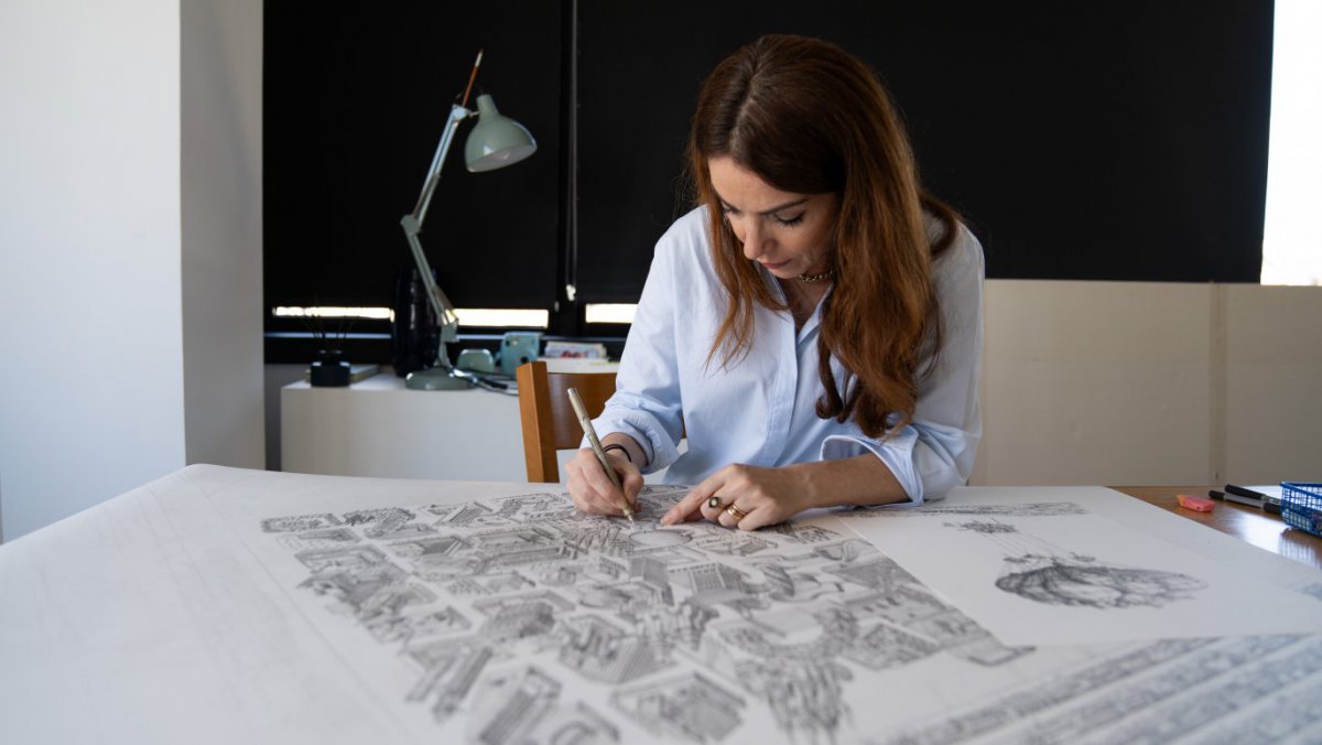 O piso do estúdio é onde a magia acontece. Ana Allagan fica deitada por horas e cria mundos futuristas e imaginários em grande escala através da ponta de sua caneta. Um portal entre diferentes realidades, onde o mundo da arquitetura e da ilustração coexistem na perfeição..