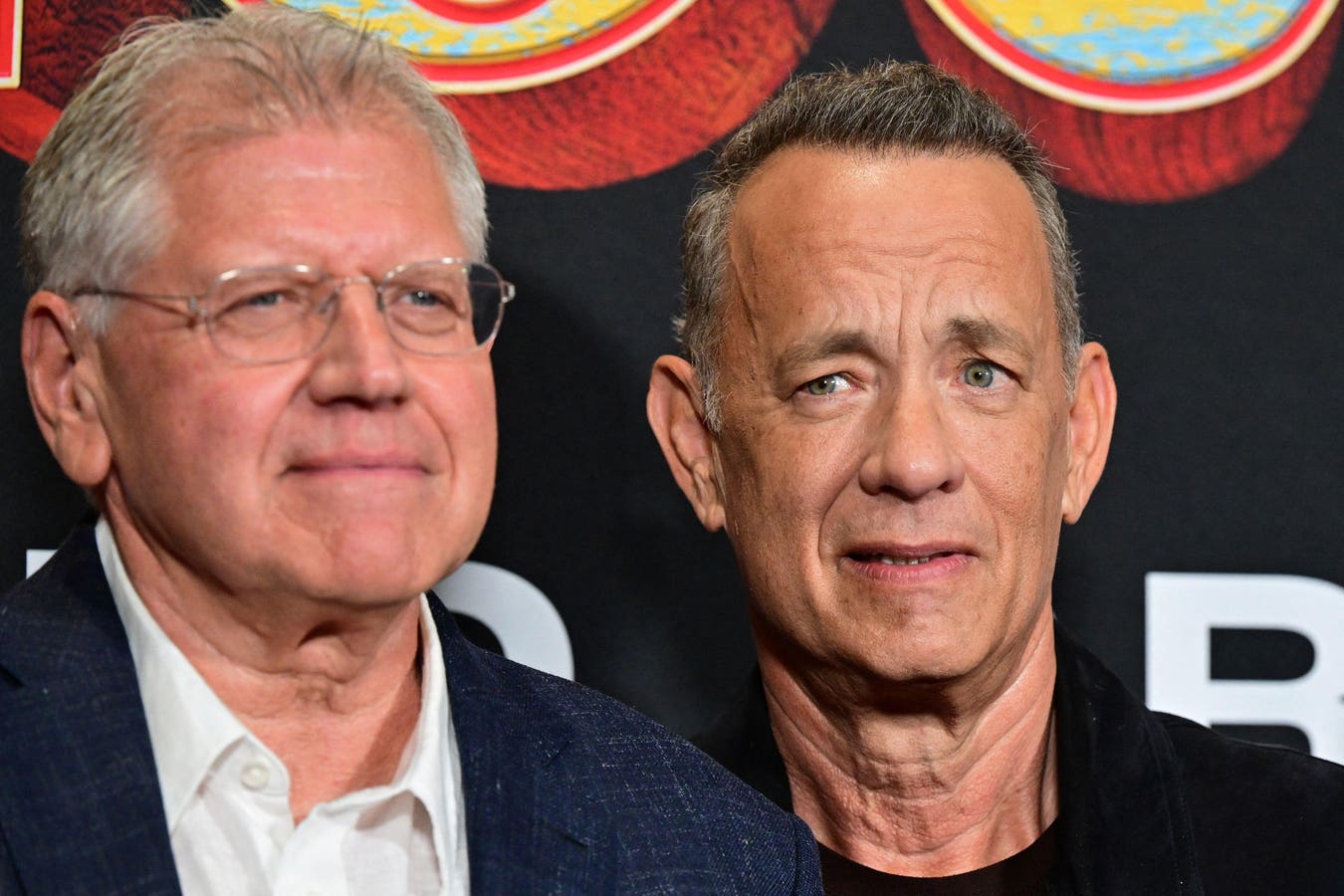O diretor americano Robert Zemeckis (à esquerda) e o ator americano Tom Hanks chegam à estreia mundial de um filme da Disney. … [+]