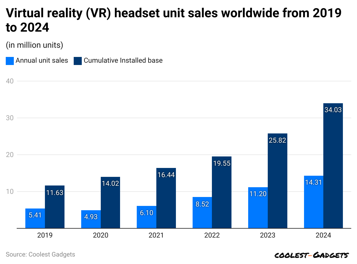 - In 2023, annual VR headset sales totaled 11.2 million units; the cumulative installed base accounted for 25.82 million units.